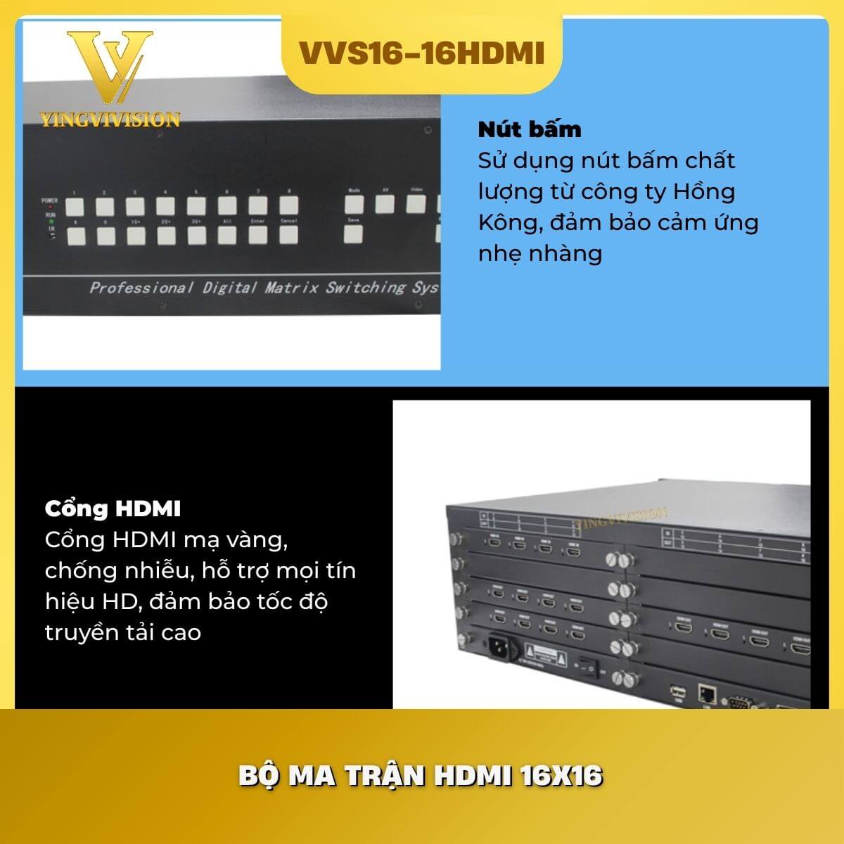 Bộ chuyển mạch HDMI 16×16 Matrix VIVISION không chỉ đơn thuần là thiết bị chuyển đổi, mà là giải pháp quản lý hình ảnh toàn diện. Với sự đầu tư kỹ lưỡng về linh kiện Đài Loan và khả năng bảo trì dạng module, đây là khoản đầu tư an tâm cho mọi công trình chuyên nghiệp.