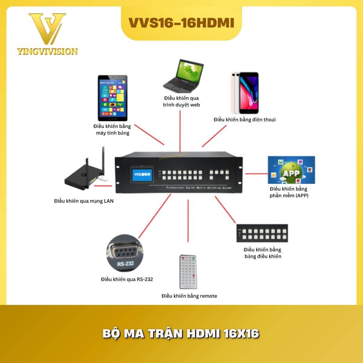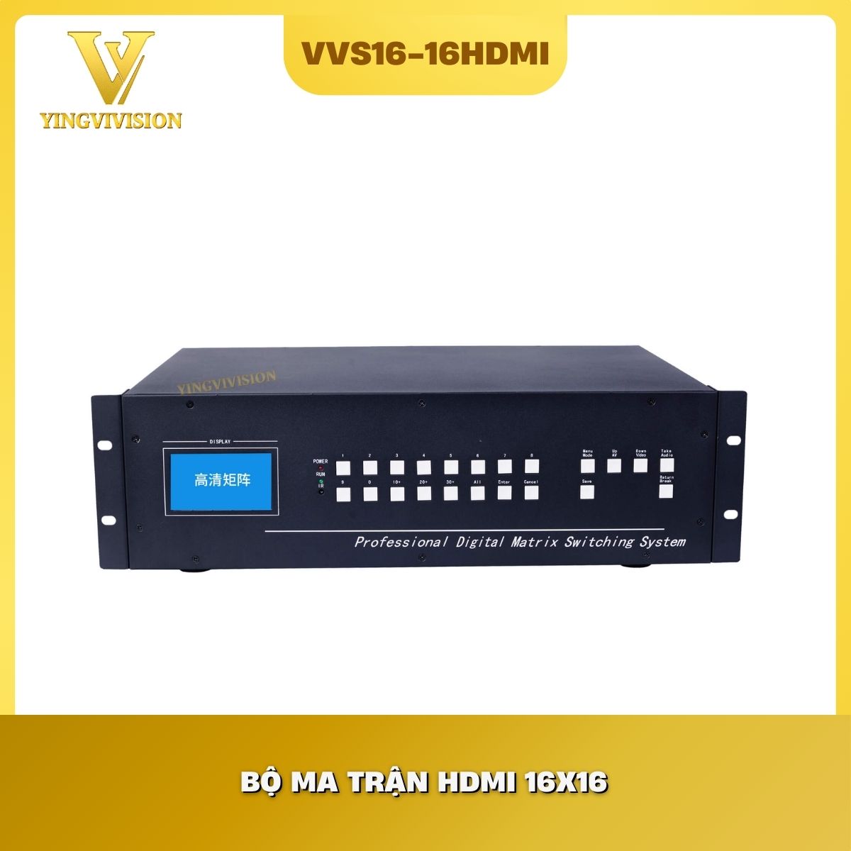 Bộ chuyển mạch HDMI 16×16 Matrix VIVISION là thiết bị xử lý tín hiệu cấp dự án, cho phép kết nối tối đa 16 nguồn phát HDMI và phân phối tới 16 màn hình độc lập. Điểm mạnh nhất của thiết bị nằm ở khả năng tùy biến ma trận tuyệt đối: bất kỳ màn hình nào cũng có thể nhận tín hiệu từ bất kỳ nguồn nào tại bất kỳ thời điểm nào, hoặc một nguồn phát có thể hiển thị đồng nhất trên cả 16 màn hình.